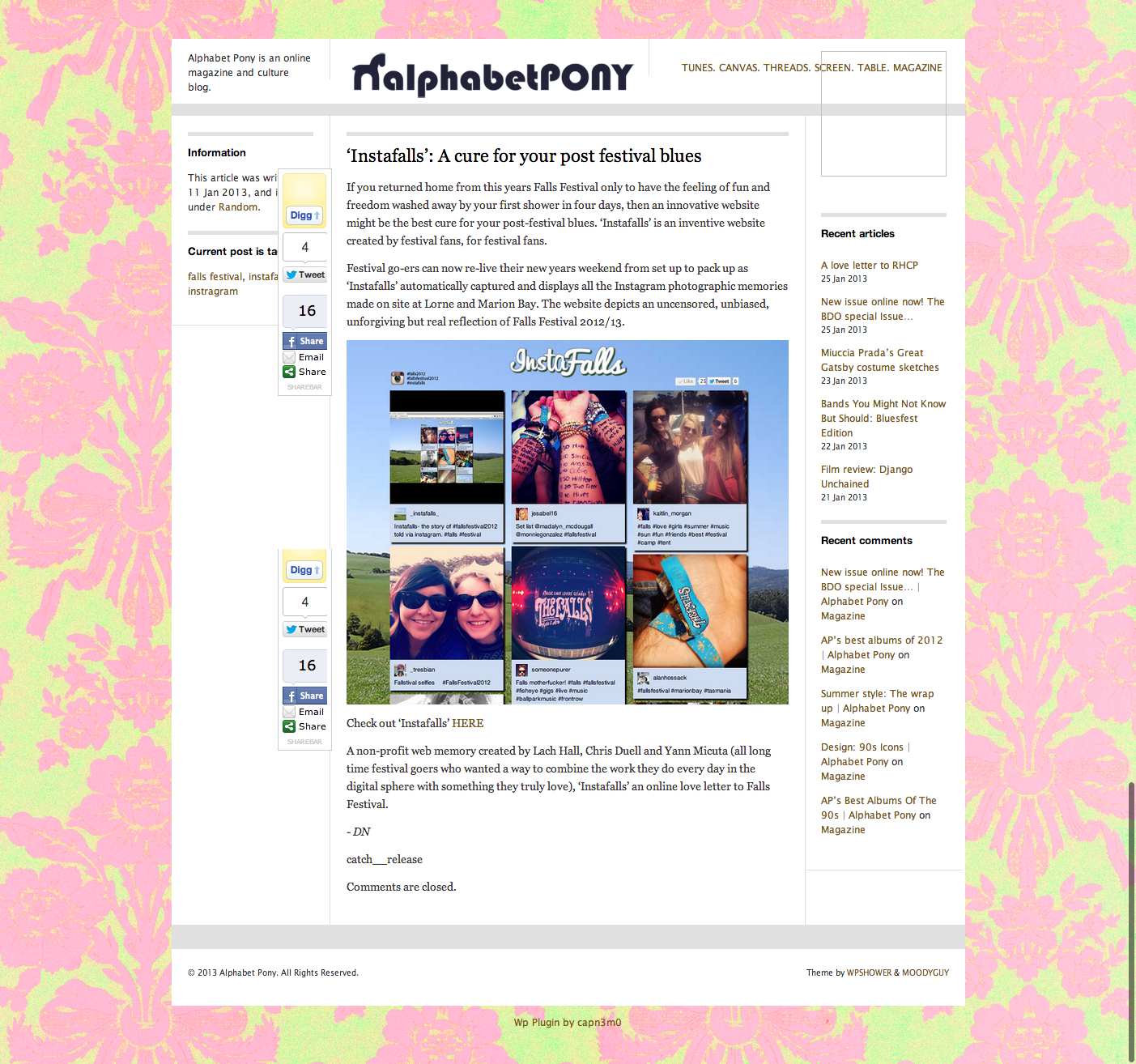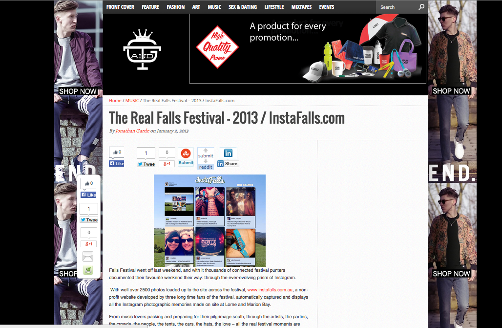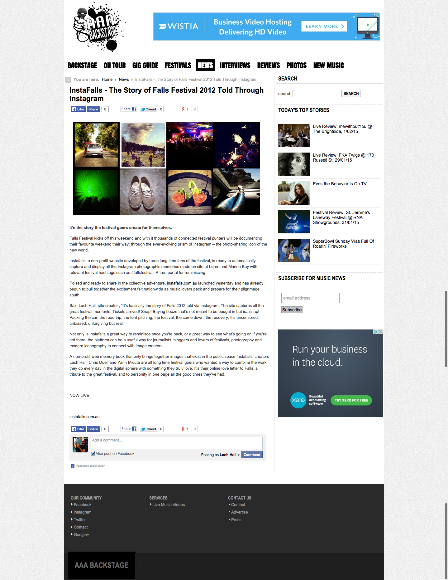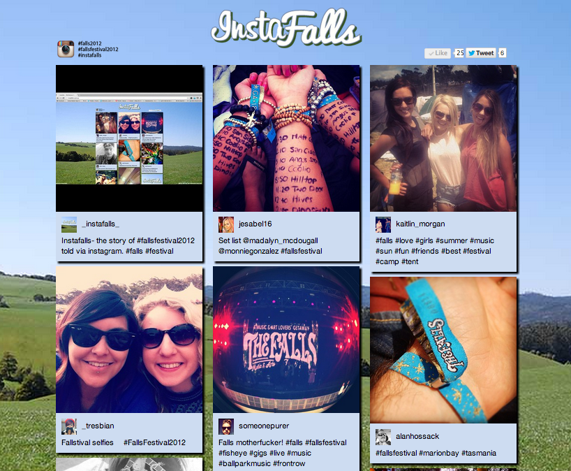 Instafalls was a fun little side project I created that automatically searched and pulled all instagram photos taken at Falls Music Festival on to the one page.