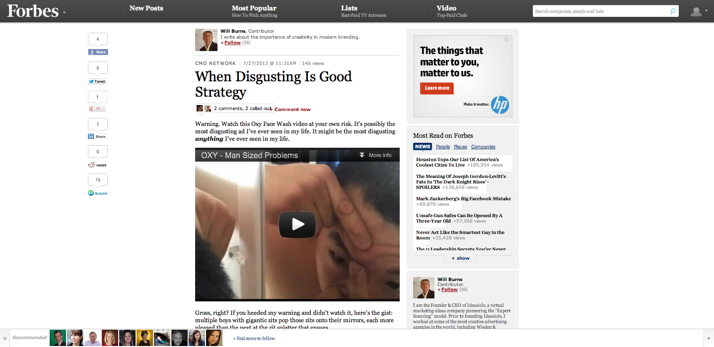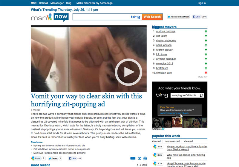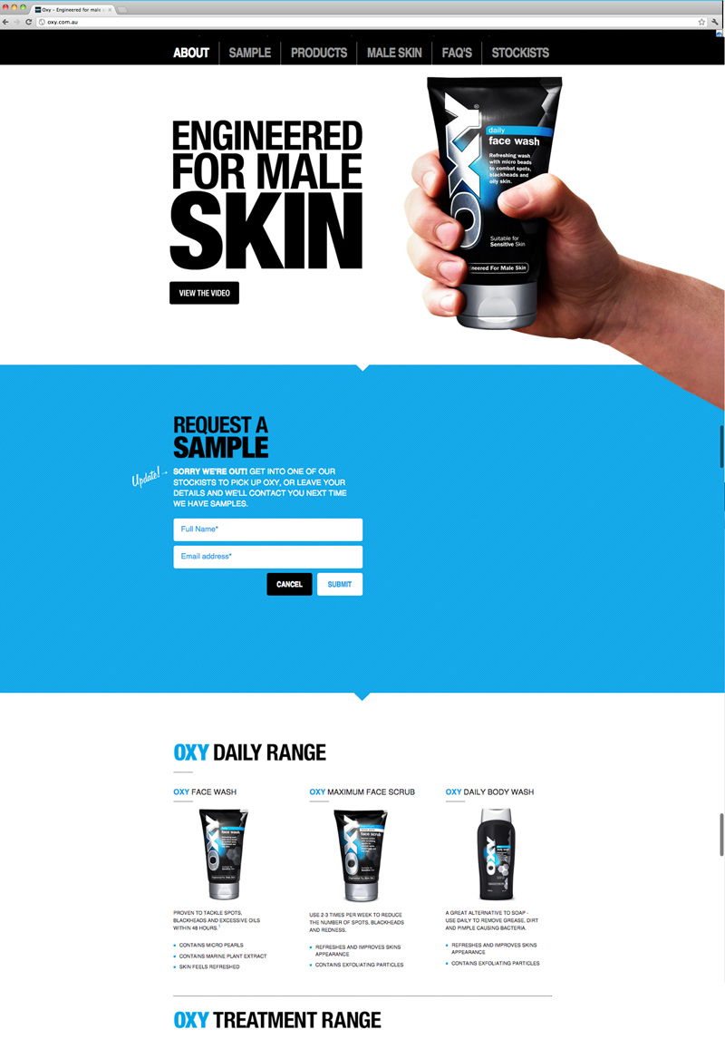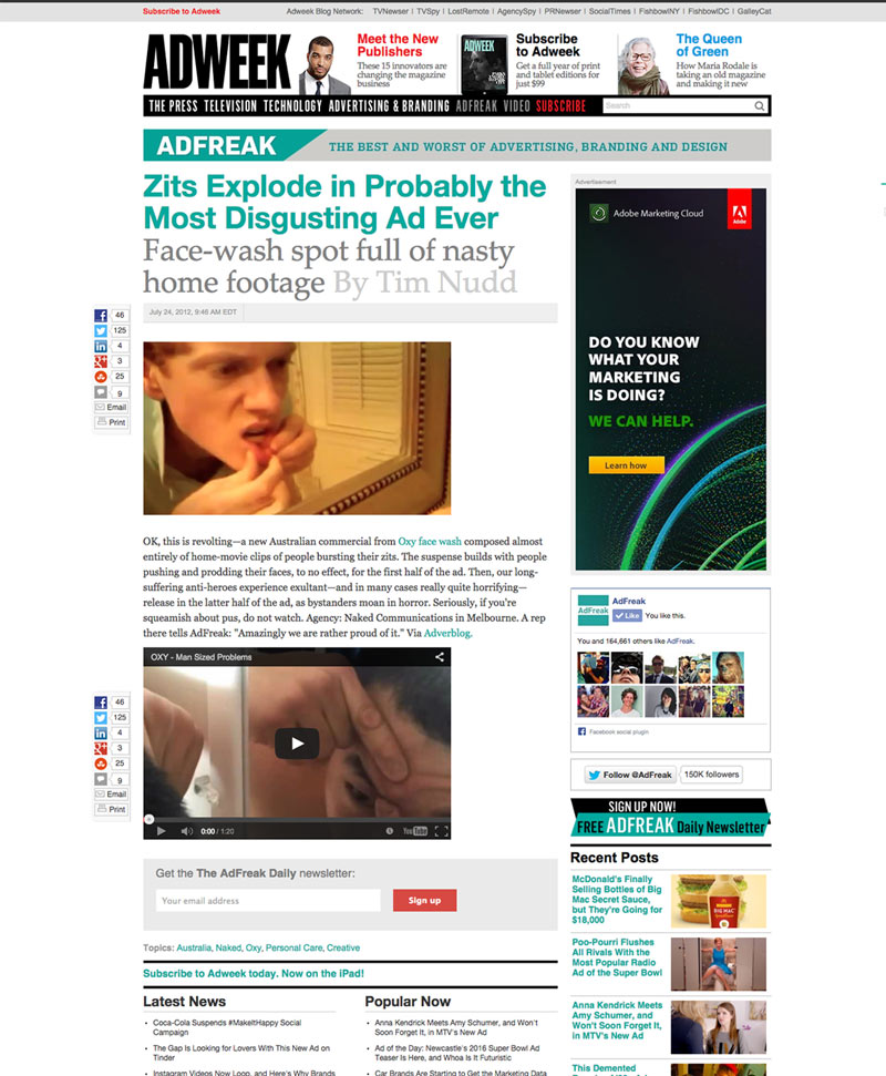 We needed a way to get young teenage guys to be aware of and request a sample of OXY pimple cream which was specifically designed for male skin. To capture their attention we mashed together the ‘best’ pimple popping videos from youtube in a disturbing but highly shareable web film with a call to action to request a free sample at the end. The video received 800,000 views within three days of launching and almost instantly sold out of samples. It has since been dubbed “the most disgusting ad of all time” by Business Insider and Adweek alike.