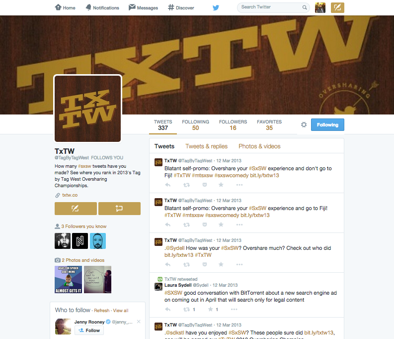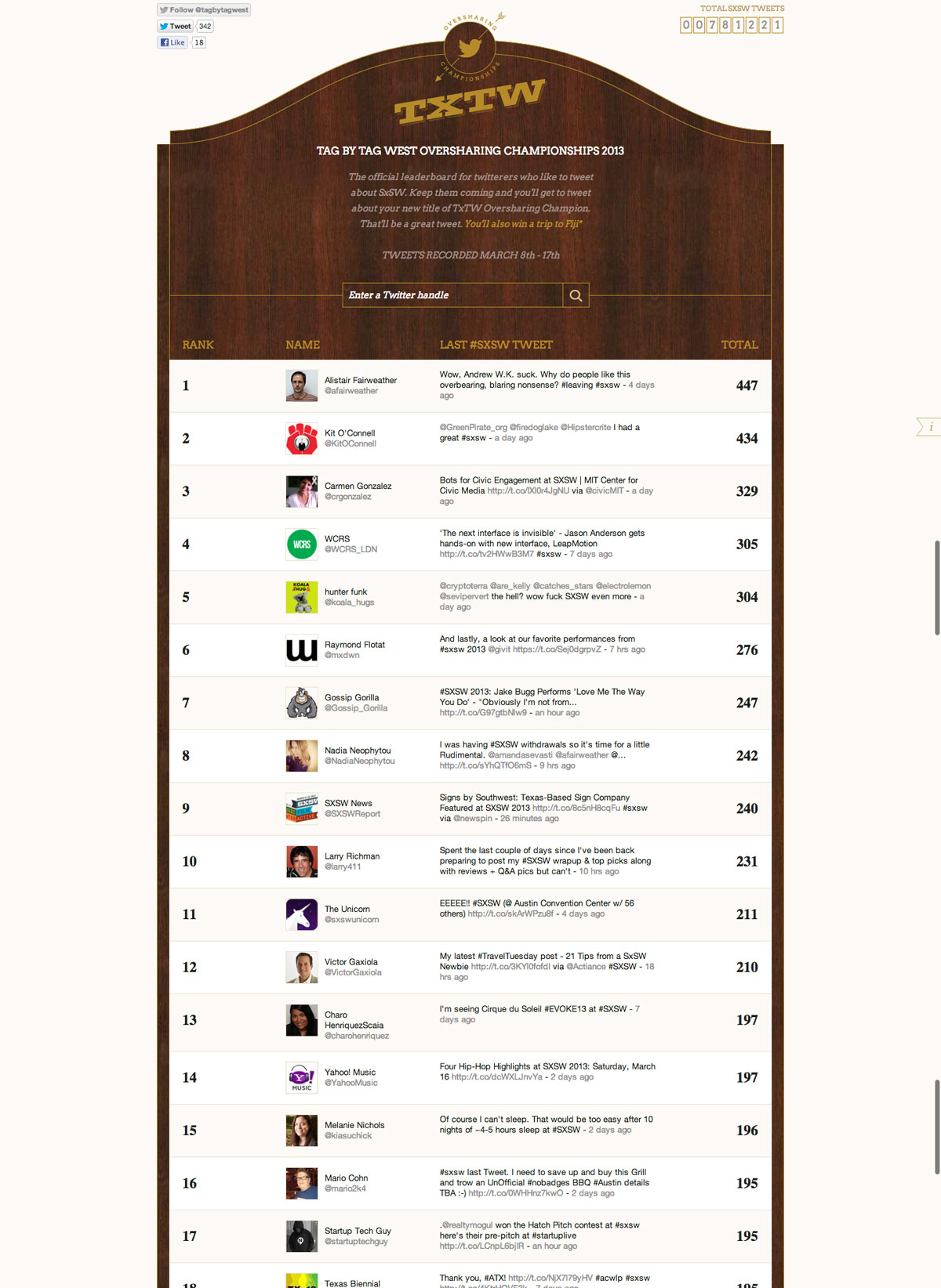 Tag by Tag West Oversharing Championships of 2013 (TxTW) is a fun little web app I developed that automatically counted, ranked and ‘shamed?’ the most proliferate South By South West tweeters during SxSW 2013.
